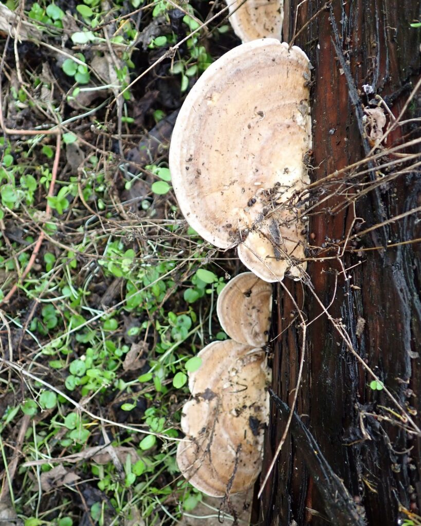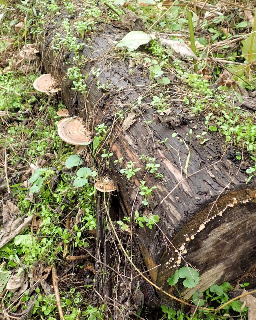 今日はウメの果樹園で草刈りをしていたのですが、スギの丸太に、サルノコシカケみたいなキノコが生えていたのです(写真3,4枚目)