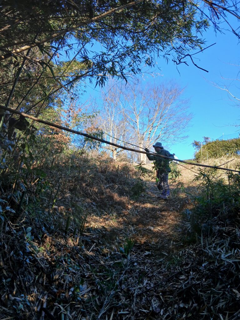 竹そのものは軽いのですが、切り出して、枝をナタで払うまでが一人では大変。