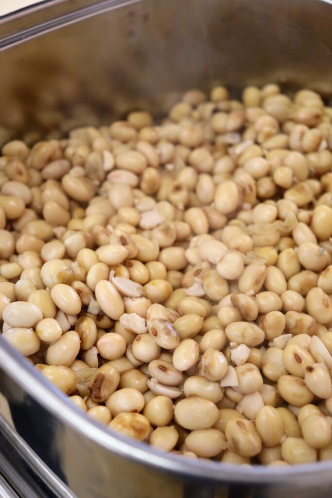 昨日のうちに茹でておいた大豆を、人肌に温め直す。