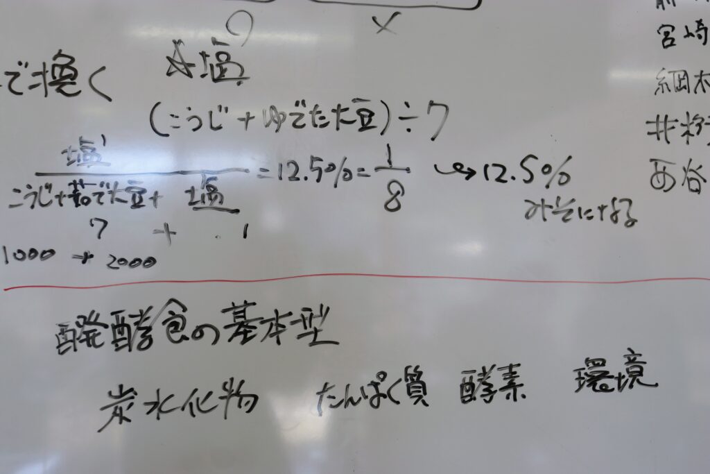 ホワイトボードに書いたのは、塩の分量(塩梅)を計算する簡単な方法です。