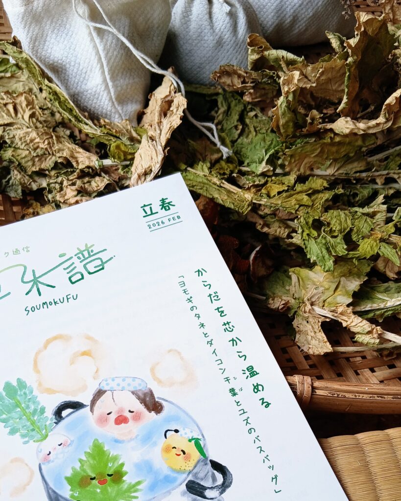 4年ぶりに復活した「さとやまパック」の第一弾は、このヨモギのタネとダイコンの干し葉、それにユズの皮をブレンドした「ハーバルバッグ」です。さらにてづくりの「ユズ胡椒」が付いてきます。